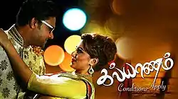 Kalyanam (Tamil: கல்யாணம்) is a 2016 Singaporean soap opera starring Karthikeyan Somasundram, Nithya Shree, Jaynesh and Eswari Gunasagar. It was created by I.Sundar[1] and is executively produced by Megastar Production's 'V.Kalaiselvan and Susiilaa Shanmugam. It aired on Mediacorp Vasantham from 4 April 2016 to 23 June 2016, on Monday through Thursday at 10:00 pm SST for 45 episodes.