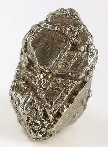 The name was coined in 1861 and is derived from the Greek root καμακ- "kamak" or κάμαξ "kamaks", meaning vine-pole.[3] It is a major constituent of iron meteorites (octahedrite and hexahedrite types). In the octahedrites it is found in bands interleaving with taenite forming Widmanstätten patterns. In hexahedrites, fine parallel lines called Neumann lines are often seen, which are evidence for structural deformation of adjacent kamacite plates due to shock from impacts.