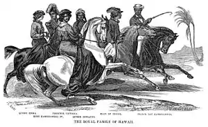 Wyllie sponsored a fancy dress ball in 1860. Even the Catholic bishop came, dressed as a bishop. Kamehameha IV's father Kekūanāoʻa came in Scottish highland dress, music was provided by German musicians, and the food by a French chef. Emma came as the earth goddess Cybele. The conservative American missionaries did not approve, especially of the dancing.[11]