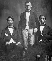 With the supervision of their guardian Dr. Judd, Alexander and his brother sailed to San Francisco in September 1849.[7][8] After their tour of California, they continued on to Panama, Jamaica, New York City, and Washington, D.C. They toured Europe and met with various heads of state, aiming to secure recognition of Hawaii as an independent country.[3] Speaking both French and English, Alexander was well received in European society. He met president of France Louis Napoleon. Sixteen-year-old Alexander Liholiho described a reception given at the Tuileries by: