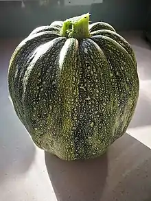 Kamokamo (also known as kumikumi) is a variety of Cucurbita pepo, grown as a summer or winter squash in New Zealand. Commonly used in Māori cuisine, the Kamokamo is a heavily ribbed oblate or prolate shaped stocky fruit with speckled green skin, ripening to an orange colour.[1][2] It is thought to have been introduced to New Zealand during European settlement around the late 19th century[3][2] and was readily adopted by Māori, displacing the calabash as a food source. Its name originates from the Māori language.[4]