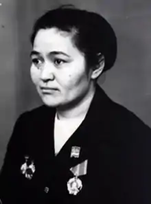 Kamshat Donenbaeva (Kazakh: Кәмшат Байғазықызы Дөненбаева; Kámshat Baıǵazyqyzy Dónenbaeva; 15 September 1943 – 9 November 2017) was a Kazakhstani agricultural laborer and served as a deputy in the Supreme Soviet from 1974 to 1989. For exceeding production goals, she was twice awarded the Order of Lenin and in 1975 received the Hero of Socialist Labour.