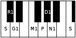 - Hindustani: S Ṟ R M P Ḏ D Ṡ