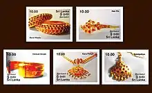 Bridal sets are the most important pieces of Kandyan jewellery. They are handmade and consist of 26 pieces of jewellery that will adorn the bride from head to waist. The set normally consists of moon and sun, head chain, karapati throatlet, earrings, 3 pendants with chains, pethi necklace, agasti necklace, sarri (thick) bangles, gedi bangles and hawadiya (hip chain). Most of these jewellery items were made using five types of metals such as gold, silver, copper, lead, brass. All these items are gold-plated. The number "5" was considered an auspicious number and considered to make it 5 times stronger. These items are embedded with red and white Indian stones designed specially to go with the spectacular designs.