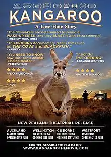 Kangaroo: A Love-Hate Story is an Australian environmental documentary produced by Second Nature Films,[1] co-written and directed by the team of Mick McIntyre and Kate McIntyre Clere. The documentary centres around the relationship that Australians share with kangaroos.[2] The documentary includes experts on different sides of the issue, and features interviews with Tim Flannery and Terri Irwin, owner of the Australia Zoo. The film opened in Australia on 5 February 2017 and in 2018 Kangaroo opened in limited release in the United States on 19 January.