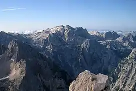 Kanjavec is a 2,569-metre (8,428 ft) mountain in the center of Triglav National Park. It lies between the Dolič Pass at 2,164 m, the Hribarice Pass at 2,306 m and the Prehodavci Pass at 2071 m. Kanjavec is also a popular ski touring destination. From the summit, there is a panoramic view of the surrounding mountains. It is relatively easy to ascend, with a few exposed areas.