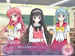 Kanojo × Kanojo × Kanojo is an erotic visual novel in which the player assumes the role of Shiki Haruomi. Much of its gameplay is spent reading the text that appears on the screen, which represents the story's narrative and dialogue. The text is accompanied by character sprites, which represent who Kyōtarō is talking to, over background art.[1] Throughout the game, the player encounters CG artwork at certain points in the story, which take the place of the background art and character sprites. Kanojo × Kanojo × Kanojo follows a branching plot line with multiple endings, and depending on the decisions that the player makes during the game, the plot will progress in a specific direction.[1]