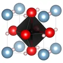 κ-Carbides crystallise in the perovskite structure type with the space group Pm3m (Nr. 221).[2] This structure was, inter alia, elucidated with XRD-measurements on steel alloys containing κ-carbide precipitates but also on single crystals of manganese-κ-carbides with a molecular formula of Mn3.1Al0.9C and a lattice parameter of a=3.87Å.[3] In steel alloys where diverse arrangements of the atoms are possible, a considerable effect of the short range ordering, e.g. of iron and manganese on the microscopic properties of the alloy, has been observed.[4] This is especially important for the role as hydrogen-traps in steels.[5]