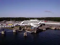 The port is served by frequent passenger ferry services to Mariehamn, Åland, Finland, operated by Viking Line, with three services per day and direction during peak season. There are also services to Naantali in mainland Finland operated by Finnlink, and to Paldiski in Estonia operated by Tallink and DFDS, although only the Mariehamn route is open to pedestrians: the Naantali and DFDS Paldiski routes require a vehicle.