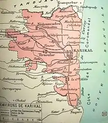 Karaikal (/kʌdɛkʌl/, French: Karikal /kaʁikal/) is a town of the Indian Union Territory of Puducherry. Karaikal became a French Colony in 1674 and held control, with occasional interruption from the British and Dutch, until 1954 (de jure in 1956), when it was incorporated into the Republic of India, along with Chandernagore, Mahé, Yanaon, and Pondichéry.