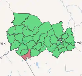 Karasuksky District (Russian: Карасу́кский райо́н; Kazakh: Қарасуық ауданы, Qarasýuq aýdany) is an administrative[1] and municipal[4] district (raion), one of the thirty in Novosibirsk Oblast, Russia. It is located in the southwest of the oblast. The area of the district is 4,321 square kilometers (1,668 sq mi). Its administrative center is the town of Karasuk.[1] Population: 46,262 (2010 Census);[2] 48,548 (2002 Census);[6] 50,374 (1989 Census).[7] The population of Karasuk accounts for 61.8% of the district's total population.[2]