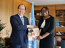 Karen-Mae Hill is the High Commissioner for Antigua and Barbuda to the United Kingdom and member of the Commonwealth's Board of Governors.[1][2][3][4] Hill is also the Ambassador Extraordinary and Plenipotentiary of Antigua and Barbuda to the Republic of Estonia.[1] She won a scholarships to study French and law at the University of Leicester in the United Kingdom before becoming the first Antiguan to win a Rhodes Scholarship to Oxford.[2] Hill is a qualified Barrister in English law. She is the founder of the Antigua and Barbuda Youth Symphony Orchestra,[3] co-founder and music director at the Potters Youth Group and an advocate for green technology.[1]