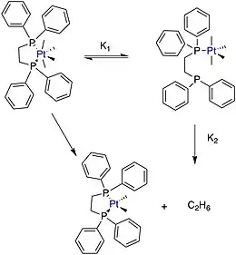 Further research by Goldberg on the study of transition metal-catalyzed reactions places additional emphasis on the metal-complex ligands. Recent publications have reported that gem-dialkyl substituents on platinum-based metal complexes can be utilized to determine the mechanism of reaction pathway and whether the mechanism includes chelate opening.[14] The gem-dialkyl substituents have been used in the past for recognizing thermodynamic properties of chemical systems, though recent studies have pushed those discoveries to the understanding of kinetic systems as well. Goldberg's research on the effects of these types of substituents on bidentate ligands and how these effects change the mechanisms and rates of reductive elimination reactions has helped advance improvements of transition metal-based inorganic and organic catalysis.