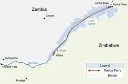 Kariba Ferries is a Zimbabwean ferry operator which operates on Lake Kariba between the fishing camp of Mlibizi (with access to Victoria Falls) in the south and Kariba town in the north. It offers an alternative to an overland journey of 1,250 kilometres (780 mi) taking 8 hours. The relaxing voyage by boat takes approximately 22 hours.[1]