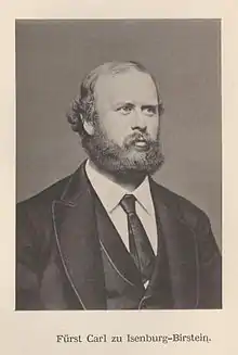Karl, Prince of Isenburg-Büdingen (full name: Karl Viktor Amadeus Wolfgang Kasimir Adolf Bodo) (29 July 1838 – 2 April 1899) was head of the mediatised German house of Isenburg and Büdingen.