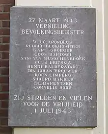 In 1943, a group of resistance members, led by sculptor Gerrit van der Veen and painter and author Willem Arondeus, meticulously planned to carry out a sabotage attack on the Amsterdam civil registry office, with the aim to destroy the records, without causing any loss of life.[2] The mission was particularly difficult because security at civil registries had been tightened up after a similar assault on an office in Wageningen in late 1942. Security guards were now posted at strategic locations in the Amsterdam civil registry office.[4] The group preparing the attack included a number of local artists and medical students, including several Jews and homosexuals, as well as a group of resistance members behind the clandestine publication Rattenkruid.[6]