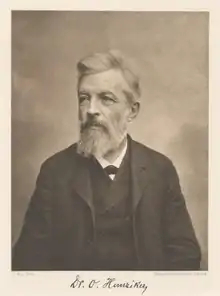 In 1860, Karl Otto was registered at the University of Zürich, studying in the Faculty of Philosophy until receiving an academic report (Zeugnis) on 26 Jan 1865. K. O Hunziker was a pastor in Unterstrass from 1867–1871, then a teacher at the seminary school of Küsnacht, and a professor and headmaster at the state college of higher education.[1] Karl Otto married Luise Pupikofer 22 Sep 1868 in Bussnang or Wängi, Canton Thurgau, Switzerland.[6] In 1875, Karl Otto Hunziker received his doctorate in philosophy from the University of Zürich.[1] From 1872–1878, Dr. Hunziker was member of the Zürich canton parliament. From 1886–1907 he taught as a private lecturer (Privatdozent) at the Eidgenössische Polytechnikum (today known as ETH Zurich or the Swiss Federal Institute of Technology). In 1890–91, he was also Associate Professor at the University of Zürich. His focus of research was Johann Heinrich Pestalozzi, a Swiss pedagogue; Karl Otto co-founded the Pestalozzianum Research Institute.[1] In 1890, Karl Otto was granted Zürich citizenship. Dr. Karl Otto Hunziker died 23 May 1909 in Kilchberg, Canton Zürich.[3]