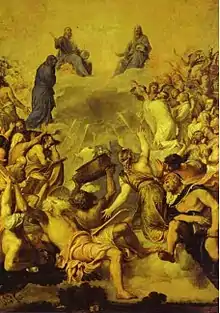 Originally commissioned in 1930 by the Vienna State Opera for performance in 1934, this much anticipated work[3] became a cause célèbre when the production was cancelled after Krenek was blacklisted in Germany by the Nazi government immediately following the German parliamentary elections in March 1933.[4] The composer believed it was its strong emphasis on Christian universality that made Karl V. "utterly intolerable" to the Nazis.[5] A concert suite for soprano (Fragmente aus dem Bühnenwerk Karl V., Op. 73a) was performed in 1936, and the opera was staged for the first time on 22 June 1938 at the Neues Deutsches Theater in Prague, by which time Krenek had fled overseas. In 1954 he revised the score for the first revival in Germany. A fully staged production of the opera was performed in the Festspielhaus of the Bregenzer Festspiele in the summer of 2008, and is available on DVD.