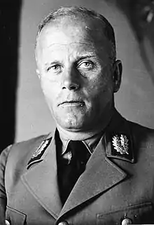 During the war, Wahl displayed great concern for troops from his Gau. He founded and published a magazine named Front und Heimat (Front and Homefront) intended for soldiers from Swabia.[15] He visited Swabian troops in France and also spent six weeks with a Swabian mountain division (German:Gebirgsjäger) in the Donetsk region on the eastern front in 1941.[16] On 16 November 1942, when the jurisdiction for the Reich Defense Commissioners was changed from the Wehrkreis to the Gau level, Wahl was named Reich Defense Commissioner for Gau Swabia. In an effort to shore up the defenses of Swabia, on 17 July 1943 Wahl announced his intention to form the Heimatschutztruppe (Homeland Defense Troop). He had not sought the approval of the Party or SS hierarchy, and the idea was immediately quashed by Reichsfuhrer-SS Himmler.[17] Wahl was promoted to SS-Obergruppenführer on 1 August 1944, and on 25 September 1944 he became the leader of Swabia's Volkssturm forces, ironically, a home defense force similar to what he had proposed the previous year.[18]