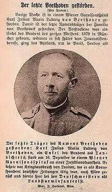 On 3 December 1917, Karl Julius underwent surgery for an intestinal blockage. A few days later, on 9 December, he died of peritonitis.[6] Although all his next of kin were listed as "deceased", the probate file stated that his aunt, Karoline Weidinger (widowed), was supposedly still living. Karl Julius was buried on 13 December 1917 next to his mother. His death as being the "last Beethoven" attracted media attention: "Yesterday the last bearer of the name Beethoven died in the Garrison Hospital. Karl Julius van Beethoven, a grandson of the great master's brother, was born in 1870 in Munich ..." (Nueus Wiener Journal, 11 December 1917); "The relatives who attended the funeral were ... Dr. Raoul E. Wedinger, his mother Hermine Weidinger, and their daughter Elsa. They were related to Mr. van Beethoven only in female lineage." (Fremden-Blatt, 17 December 1917); and the Das interessante Blatt published a photograph of Karl, dated 20 December 1917.
