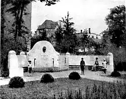 In his honor, the city of Lübeck created the Von-Großheim-Platz in der Vorstadt St. Jürgen, near his parents' home, in a field that had been left fallow for many years. It included a fountain made of muschelkalk, and adorned with a portrait relief made by the sculptor, Ludwig Manzel.[1] During World War II, the lawn was converted to a pond. In 1990, the pond was removed and the fountain fully restored.