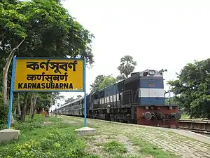 In 1913, the Hooghly–Katwa Railway constructed a 5 ft 6 in (1,676 mm) broad gauge line from Bandel to Katwa, and the Barharwa–Azimganj–Katwa Railway constructed the 5 ft 6 in (1,676 mm) broad gauge Barharwa–Azimganj–Katwa loop.[3][4] With the construction of the Farakka Barrage and opening of the railway bridge in 1971, the railway communication picture of this line were completely changed. Total 26 passengers and local trains stop at Karna Subarna railway station. The rail distance between Karna Subarna and Howrah is approximately 192 km.[5]