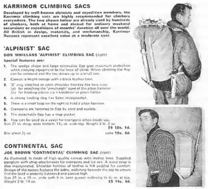 ![]() Early advert for Karrimor's Alpiniste and Joe Brown backpacks, circa 1960s. The Alpiniste "dominated" the 1960s in terms of climbing packs.[20] |