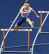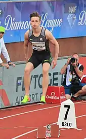 In March, Warholm won gold in the 400 m at the 2019 European Athletics Indoor Championships. His time of 45.05 s equalled the European record set by Thomas Schönlebe in 1988.[15] In June, at the Oslo Bislett Games he broke the European men's 400 m hurdles record with a time of 47.33.[16] At the Müller Anniversary Games in July, Warholm improved on his 400 m hurdles time, taking it to 47.12 s.[17] At Weltklasse Zurich in August, Warholm set a new European record in the 400 m hurdles, with a time of 46.92, making him the third person to run under 47 seconds for the distance. He was chased to the finish line by Rai Benjamin, who became the fourth person to break 47 seconds, with a time of 46.98.[18] At the 2019 World Athletics Championships in Doha, Qatar, he won the 400 m hurdles in a time of 47.42 seconds, retaining his championship from 2017.[19]