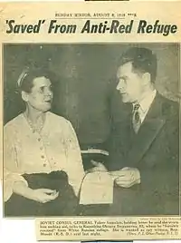 Upon returning to the Consulate Lomakin immediately invited a large group of journalists and mass media workers. In this emergency press conference Kasenkina told how she was drugged and kidnapped by "White Russian bandits". Lomakin showed the envelope and Kasenkina's handwritten letter. He read aloud extracts from the letter in English translation. The photostatic copy was given to the United States Department of State and Federal Bureau of Investigation. On August 8, all major US newspapers came out with photos from the press conference, and The New York Times[24] and New Herald Tribune[25] published detailed reports. Countess A. Tolstaya stated that she was against providing shelter to Kasenkina believing she was sent for spying, in particular, to determine the location of Samarins.[26] A separate article printed a statement by Congressman Karl Mundt, – a member of the HUAC requiring that Kasenkina should be questioned as a witness of USSR espionage activities.[27]