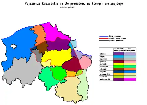 The Kashubian Lake District, according to the division made by Konradzki has an area of about 3000 km km2.[2] To the north, the mesoregion borders with the ice-marginal valley of the river Reda and the river Łeba; which separates the lake district away from the Żarnowiecka Upland, and the Damniacka Upland. From the east (the area of Gdańsk and Gdynia), the lake district is bordered by the Kashubian Coast. Beyond, the region borders with the Starogradzkie Lake District, from the south-east, the region is bordered by the Tucholski Forest. The western border is closed in by the Polanowska Upland.