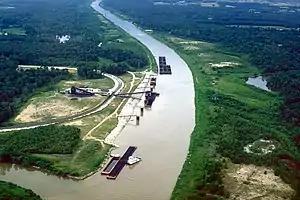 The Kaskaskia River is a tributary of the Mississippi River, approximately 325 miles (523 km) long,[2] in central and southern Illinois in the United States.[3] The second largest river system within Illinois, it drains a rural area of farms, as well as rolling hills along river bottoms of hardwood forests in its lower reaches. The lower reaches of the river have been canalized to allow barge traffic.