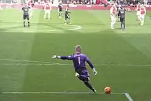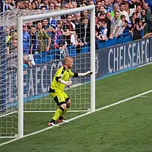 In the first month of the season, Schmeichel was shown a seemingly needless red card in the 79th minute of Leicester's away game to Nottingham Forest on 20 August 2011 after receiving two yellow cards for "unsporting conduct". He received the first card for moving the ball from the penalty spot as Forest's Lewis McGugan was about to take a kick, then received his second for throwing the ball away after the spot kick was successfully converted. After the match, Schmeichel apologized, claiming his back was turned to the referee so did not know he had received the first of the yellow cards. "I didn't know I had been booked as I had my back to the ref otherwise I would never have done that," he said on his personal Twitter page.[56][57] Despite this, Schmeichel's performances for Leicester quickly began earning him plaudits, with his then manager Sven-Göran Eriksson comparing him with England number 1 goalkeeper Joe Hart,[58] and teammate and former England international Paul Konchesky describing him as "one of the best [goalkeepers] he has ever played with".[59] A short-distant reaction save against Portsmouth in November 2011, in particular, earnt Schmeichel praise and was described by Portsmouth manager Michael Appleton as "one of the best saves I have seen in a very long time".[60] and by Leicester manager Nigel Pearson as "a world-class, outstanding save and was very important at that point of the game".[61]