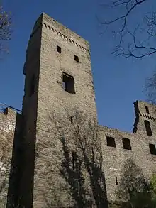 The castle consists of an inner and outer baileys. The inner ward includes the remains of the defensive bergfried, the enceinte and two residential buildings. The older east building dates to the 14th century; excavations in 1990-93 uncovered its cellar. The ruin on the west side of the inner bailey that can be seen from far away is what remains of the east end of the palas and the adjacent rectangular powder tower. Both of these buildings were probably built no earlier than the 16th century. On the east side, facing the town, there is a secondary defensive wall or zwinger. In the outer bailey, two modern buildings now stand on old foundations. Originally entry to the castle was by way of a gate tower in the north corner. The current entrance is modern.