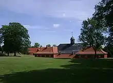 The Commander's House (Danish: Kommandantboligen) served as the residence of the commander of Kastellet. It was built in 1725 in the Baroque style by architect and master builder Elias Häuser who also designed the first Christiansborg Palace which burned in 1794. Built in yellow-dressed masonry with white detailing, it consists of two floors under a red tile roof. The triangular pediment is decorated with a relief and Christian VII's monogram under topped by a crown. It served as the official residence of the Chief of Defence until 2008.[3]