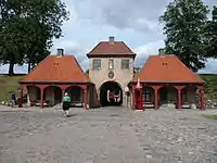 The Citadel has two gates, King's Gate on the south side, facing the city, and Norway Gate on the north side of the edifice, which both date from 1663 as part of Ruise's original citadel. They are built in the Dutch Baroque style, and are on their interior side flanked by guardhouses. The King's Gate is decorated with garlands and pilasters, and a bust of King Frederik III. The clock and two bells on the interior facade of the gate come from the Central Guard House at Kongens Nytorv and were installed in 1874 when the central guard moved to the Citadel. In front of the gate stand two so-called caponiers from where it was possible to keep assaulting troops under fire. The Norway Gate used to face open countryside outside the city, and has therefore been built to a more simple design. The caponiers of this gate were demolished in the late 19th century.