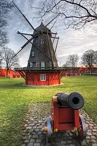 Since a fortified city needed secure supplies, including supplies of flour and rolled groats, in the event of siege, numerous windmills were constructed on the bastions.[4] In 1800, a total of 16 windmills were found on the ramparts of Copenhagen. The mill at Kastellet is the last which is still working, while another one, Lille Mølle at the Christianshavn Rampart, was transformed into a private home in 1915 and now survives as a historic house museum.