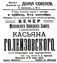 In 1922, he became the impresario of his own company, the Moscow Chamber Ballet, for which he devised some of his most popular dances, including Faun set to Claude Debussy's music and Salome, with music from Richard Strauss's opera. His most popular early work is Joseph the Handsome (1925), music by Sergei Vasilenko, written for the Bolshoi's Experimental Theater. Its content angered conservatives and it was quickly removed from the repertoire.[3] Later works for the Bolshoi that also met with conservative objection include Lola (1925; music by Vasilenko) and The Whirlwind (1927).[4]