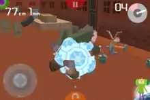 There are multiple control scheme options available. In the "Acceleration Sensor" scheme, the accelerometer of the gaming device is utilized, and Prince is controlled by physically tilting the device. The "Double Virtual Pad" scheme, where dual virtual sticks are presented on-screen, is the most similar to the traditional style of controls featured in the original Katamari Damacy game. The third control scheme, "Single Virtual Pad", which is chosen by default, is the same as the previous scheme in that it also utilizes multi-touch, but only a single virtual stick is displayed on-screen. Regardless of the controls chosen, the option to quickly turn Prince around is achieved by tapping an on-screen button located at the bottom of the display.