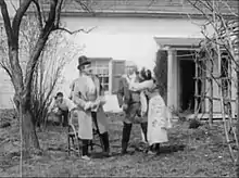18. A village church with a group of children on the stairs. Katheleen holding Terence's arm appears at the door of the church. They slowly walk down the stairs, followed by their guests, while the children throw petals of flowers.[1]