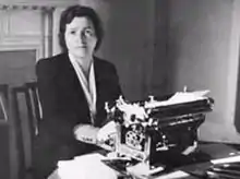 ![]() seated at a typewriter in the Piccadilly Hotel London in 1938 | |