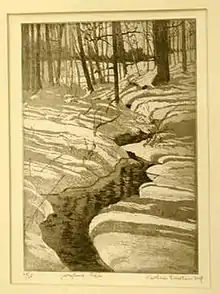 During the years from 1911 to 1920[5] Cawein and her sister lived with their widowed mother in the Bronx and worked as piano roll editors.[29] In 1920 Cawein and her mother moved from the Bronx to live with Olga, and Olga's husband in a house on Bear Ridge Road in Pleasantville, New York.[29][30] In 1930, then studying at the Art Students League, Cawein lived with her mother in a house by the train station near the center of the village of Pleasantville.[31] After this move, she made etchings of Pleasantville scenes, including the one shown at right.