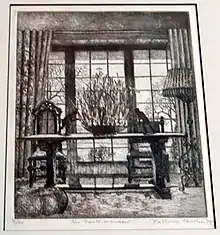 At about this time, Cawein became the protégé of a wealthy Pleasantville couple, Seabury C. Mastick and his wife Agnes Warner Mastick[32] and in 1932 the Masticks hosted a reception for her and another Pleasantville artist to open an exhibition of their work that was held in the parish house of a local church.[1] In 1946 Cawein moved again, this time to a studio and residence on Mountain Road in Pleasantville.[5] In 1956 and again in 1960 she traveled to Europe with the Masticks,[33][34] as their assistant and traveling companion.[23] In 1964, a year after Agnes Mastick's death, she and Seabury Mastick married.[5][note 4] Although Cawein had no direct connection with Pacific University in Forest Grove, Oregon, she became a benefactor of the school after receiving her inheritance from the Mastick estate. Her donations included a contribution to the endowment fund from the sale of the Mastick home in Pleasantville, the establishment of a scholarship fund, and both ownership of her etching plates and the receipts from sale of prints made from them.[36][35][note 5] In 1984 the university honored Cawein by establishing the Kathrin Cawein Gallery of Art, funded by matching grant funds from the Oregon Arts Commission.[36]