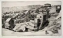 Cawein's early work earned awards. Her 1934 etching "South Window" (shown at left) appeared in a juried show called the International Exhibition of Contemporary Prints, held at the Art Institute of Chicago in conjunction with the Chicago World's Fair.[12] In 1936 her drypoint, "Telegraph Hill, San Francisco, in 1869" (shown at right) won the Frederick Talcott Prize, an award given annually by the Society of American Etchers for the best print by a non-member to be shown at its annual exhibition.[21] In 1944 her drypoint sketch, "Uncle Clarence's Barn, Fairfield, N.Y." received honorable mention in the annual exhibition put on by the National Association of Women Artists.[22] In 1947 an etching of Cawein's won an award at the 55th Annual Exhibition of the National Association of Women Artists.[4]