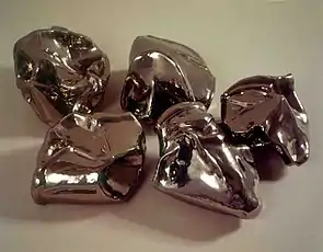 The exhibition "Dear Mr. Armstrong" (Janice Guy, 1995) included letters of romantic longing from hyperfeminine characters that recalled Surrealist automatic writing and Concrete poetry—and were considered controversial by some feminist critics—alongside handwrought, iridescent, undulating ceramic sculptures titled Moon Rocks.[5] "Love on Lake Erie" (AC Project Room, 1996) combined the theme of love, notions of the moon and its mythological connotations of the female, and imagery of the first lunar expedition.[25][39][24] Its work included an otherworldly, silvery wall sculpture (The Moon), porcelain biomorphic objects, and diagrammatic drawings of landscapes and astronauts alongside romantic text, all revolving around analogous, barren encounters of astronaut and moon, male and female, viewed from different points in time, distance and fantasy;[25][6] an ethereal video, Future Perfect, superimposed images of a woman's speaking lips and stomach in a pink circle with scenes of the moon landing.[25][6][24][1]