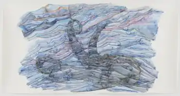 In the show "Oedipus Rex: The Drowned Man" (Renaissance Society, 1997) Schimert shifted to water imagery and softer materials such as tape, aluminum foil and clay, while exploring themes of blindness, oblivion or rapture, and fate.[18][29][41] Her semi-abstract drawings symbolically mapping Oedipus's travels (The Oedipal Blind Spot) constituted the cornerstone of the show; its works also included freestanding, biomorphic and vessel-like ceramic pieces, three-dimensional wall reliefs, and an underwater film of a man drowning in a sparkling blue sea.[29][18][42] Some of this work was reconfigured for installations at the 1997 Whitney Biennial and her 1999 BAMPFA exhibition, which included new drawings and a letter to Freud.[27][42][31][8]
