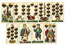 We are told that it was a game played on holiday evenings alongside Hahnrey or Snip Snap Snorem.[4] This classic version continues to be recorded during the 18th century, but in the mid-19th century a more elaborate description appears, akin to the Rams group in which players could drop out and in which the trump Jack is the commanding card and the Jack of the same colour is the second-highest trump.[5][lower-alpha 1]