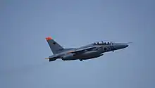 The Kawasaki T-4 is a Japanese subsonic intermediate jet trainer aircraft. It is a twin-engined aircraft, being powered by pair of Ishikawajima-Harima-built F3-IHI-30 turbofan units. These engines, which were capable of generating up to 15.7 kN (3,520 lbf) of thrust, were indigenously-developed in conjunction with the T-4.[5] Flight International observed that the performance of the T-4 was comparable with several widely exported jet trainers, such as the Franco-German Dassault/Dornier Alpha Jet and British BAE Systems Hawk. Specifically, the T-4 possessed a lower wing loading and 20 per cent greater thrust-to-weight ratio than either of these aircraft, easily permitting an initial climb to altitude rate of 3,000 m (10,000 ft) per minute.[12] While no combat-orientated model of the aircraft has been developed to date, the standard T-4 features three hard points, enabling the installation of various air-to-air missiles, bombs, and a gun pod.[2]