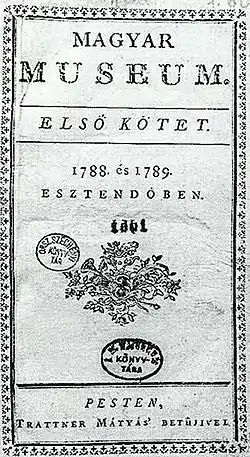 On November 13, 1787 Kazinczy together with Dávid Szabó Baróti and János Batsányi in order to organize the literary movements of the Hungarian literature of that era established the Magyar Museum periodical. This was the first literary magazine in Hungarian language. But already after the first edition Kazinczy got into a debate on what kind of direction do they want to give to their periodical. Kazinczy recommended the title Magyar Parnassus instead of Magyar Museum and thought of a belles-lettres-like magazine with translations and critics. Batsányi wanted to create a more general and practical journal. Their political disagreement was deepened by the debate. Kazinczy was a Josephinist, a follower of Joseph II. Unlike Batsányi who was known as a member of the reform movement. Kazinczy soon left the editorial of the periodical.[15]