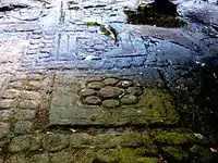 Sequentially, while walking along a path which skirts the eroded channel of the river-formed natural stone bridge, one can see a pair of Vishnu sculptures with Lakshmi seated at his feet in a reclining pose. Upstream of the bridge, there is a sculpture of Shiva and Uma mounted on the bull. Approximately 30 metres (98 ft) downstream of the bridge, there are additional Vishnu sculptures. Further downstream up to the water fall and till the water pool are the Sahasra lingas in Sanskrit language with English equivalent name of "Thousand Lingas".[1] The sculpted lingams in the coarse sandstone river bed outcrops are seen from about 6 metres (20 ft) downstream of the bridge. According to the journalist Teppo Tukki of Phnom Penh Post who visited the site in 1995, the lingams, some of which date back to the 9th century, are about 25 centimetres (9.8 in) square and 10 centimetres (3.9 in) deep and lined in a perfect grid pattern.[1][5] The river runs over them, covering them with 5 centimetres (2.0 in) of pristine water. The holy objects are designed to create a "power path for the Khmer Kings".