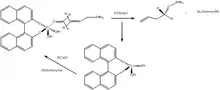 Maruoka and Kii developed a bidentate Ti(IV) binol ligand for the allylation of aldehydes with the aim of restricting M-O bond rotation between the lewis acid and the aldehyde in order to improve enantiomeric excesses. The bidentate ligand contains two titaniums, binols, and an aromatic diamine connecting moiety, gave enantiomeric excesses of up to 99%.[16] Improved stereoselectivity is proposed to come from double activation of the carbonyl from the titaniums, a hypothesis supported by C13 NMR and IR spectroscopy studies on 2,6-γ-pyrone substrate. The most convincing evidence that the M-O rotation is restricted comes from NOE NMR studies on trans-4-methoxy-3-buten-2-one. Radiation of methoxyvinyl protons in free enone and in enone complexed with monodentate Ti(IV) show s-cis and s-trans conformations, while radiation of the enone in a bidentate Ti(IV) complex showed predominantly s-trans conformers. In 2003, this group extended the allylation strategy using this bidentate catalyst to ketones.[17]